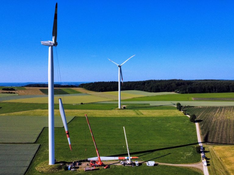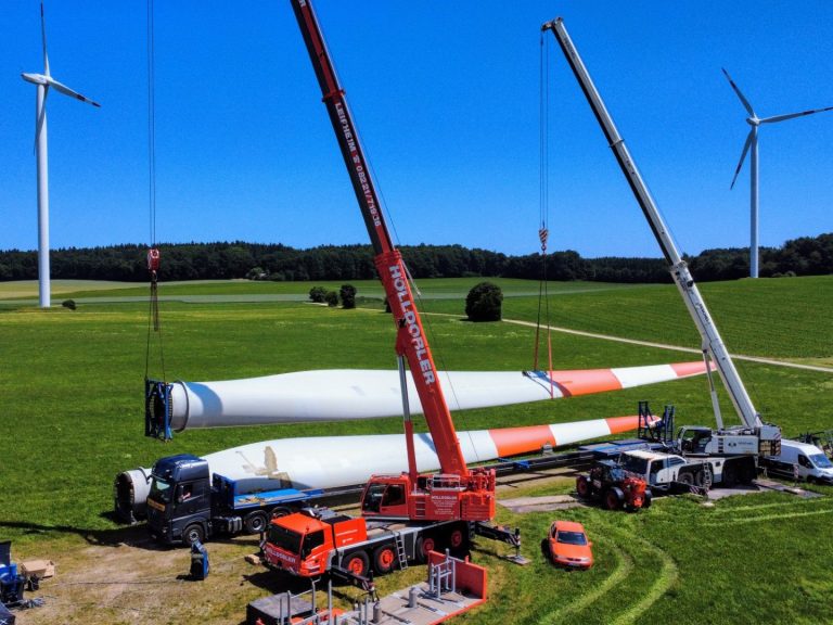 Das Umlagern der beiden Rotorblätter erfolgte mithilfe eines zweiten Krans. Im Anschluss wurde das Blattlager umgebaut und das Rotorblatt wieder fachgerecht an der Nabe montiert.