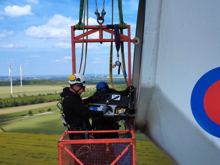 Im ersten Schritt wurde die Nabe mit dem für den Einsatz benötigten Equipment aufgerüstet und vorbereitet. Das beschädigte Rotorblatt wurde anschließend über ein Umlenksystem entlang einer Seilstrecke kontrolliert bis zum Boden abgelassen. Ein Hilfskran unterstützte das Handling beim Ablegen des Blattes in die Bodeneinheit des BGWS Systems.